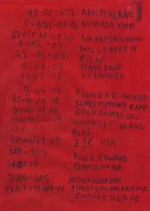 Ik hou me er aan om telkens op te schrijven waar en waarom ik er op slaap. Zo komt het dat ik nu 2 lappen heb liggen van versleten luchtmatrassen. Met de eerste ben ik nog op kamp geweest toen ik nog zelf Loods was, op de tweede zie je mooi de oorsprong van Quarantzee staan 😀 Klik op de afbeeldingen als je van dichterbij wil kijken.