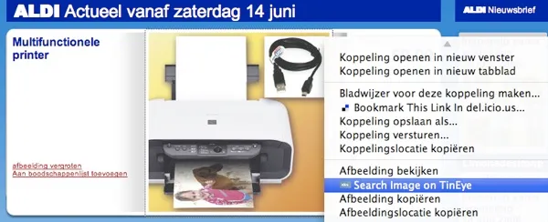 Nu ben ik daarnet die printer uit de Aldi aan het checken. Er staan daar wel wat specificaties bij, maar veel ben je er niet mee. Laat staan een merk of type. Bon, dan maar eens rechts geklikt op die afbeelding…