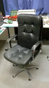 Iedere deftige studio heeft wel zo een ferme leren bureaustoel staan. Dit mocht dus ook niet in Studio Staaldraad ontbreken. Voor 5 euro heb ik onderstaand exemplaar op de kop kunnen tikken in de kringloopwinkel. Eigenlijk voor 4,5 euro, want ik heb nog 20 Belgische frank gevonden onder de zitting. Hij is verre van intact, maar nu kan ik tenminste om de vijf minuten achteruit leunen in m’n big-ass producer-chair. (Regi: als je hem wil is ie van u!)